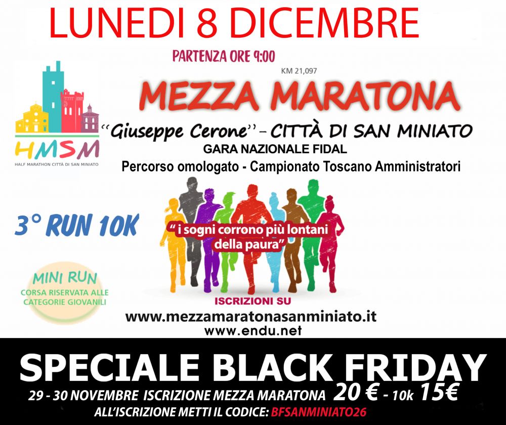 Ti ricordiamo che fino alla mezzanotte è attivo il black friday, iscriviti alla mezza maratona città di San Miniato o alla 10K a prezzi speciali